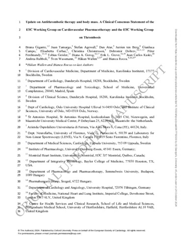 This is a pre-copyedited, author-produced version of an article accepted for publication in European Heart Journal - Cardiovascular Pharmacotherapy following peer review. The version of record Bruna Gigante, Juan Tamargo, Stefan Agewall, Dan Atar, Jurrien ten Berg, Gianluca Campo, Elisabetta Cerbai, Christina Christersson, Dobromir Dobrev, Péter Ferdinandy, Tobias Geisler, Diana A Gorog, Erik L Grove, Juan Carlos Kaski, Andrea Rubboli, Sven Wassmann, Håkan Wallen, Bianca Rocca, Update on antithrombotic therapy and body mass. A Clinical consensus Statement of the ESC Working Group on Cardiovascular Pharmacotherapy and the ESC Working Group on Thrombosis, European Heart Journal - Cardiovascular Pharmacotherapy, 2024;, pvae064 is available online at: https://doi.org/10.1093/ehjcvp/pvae064. |
