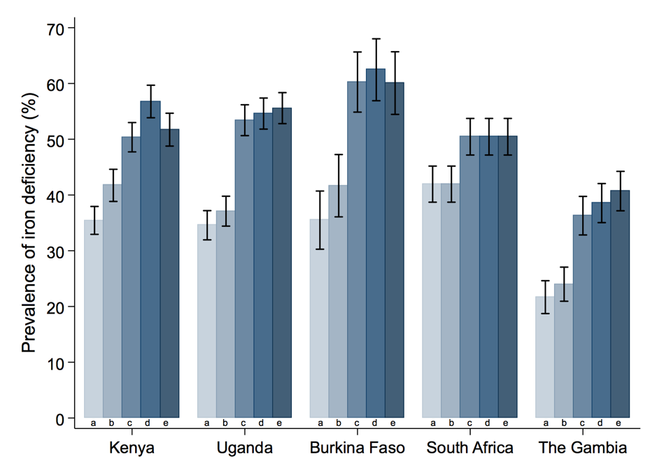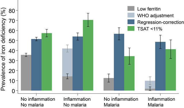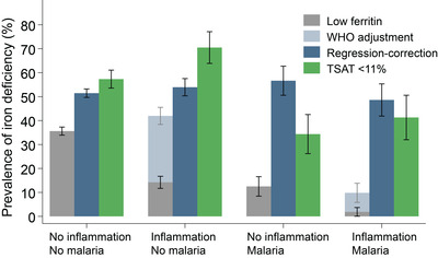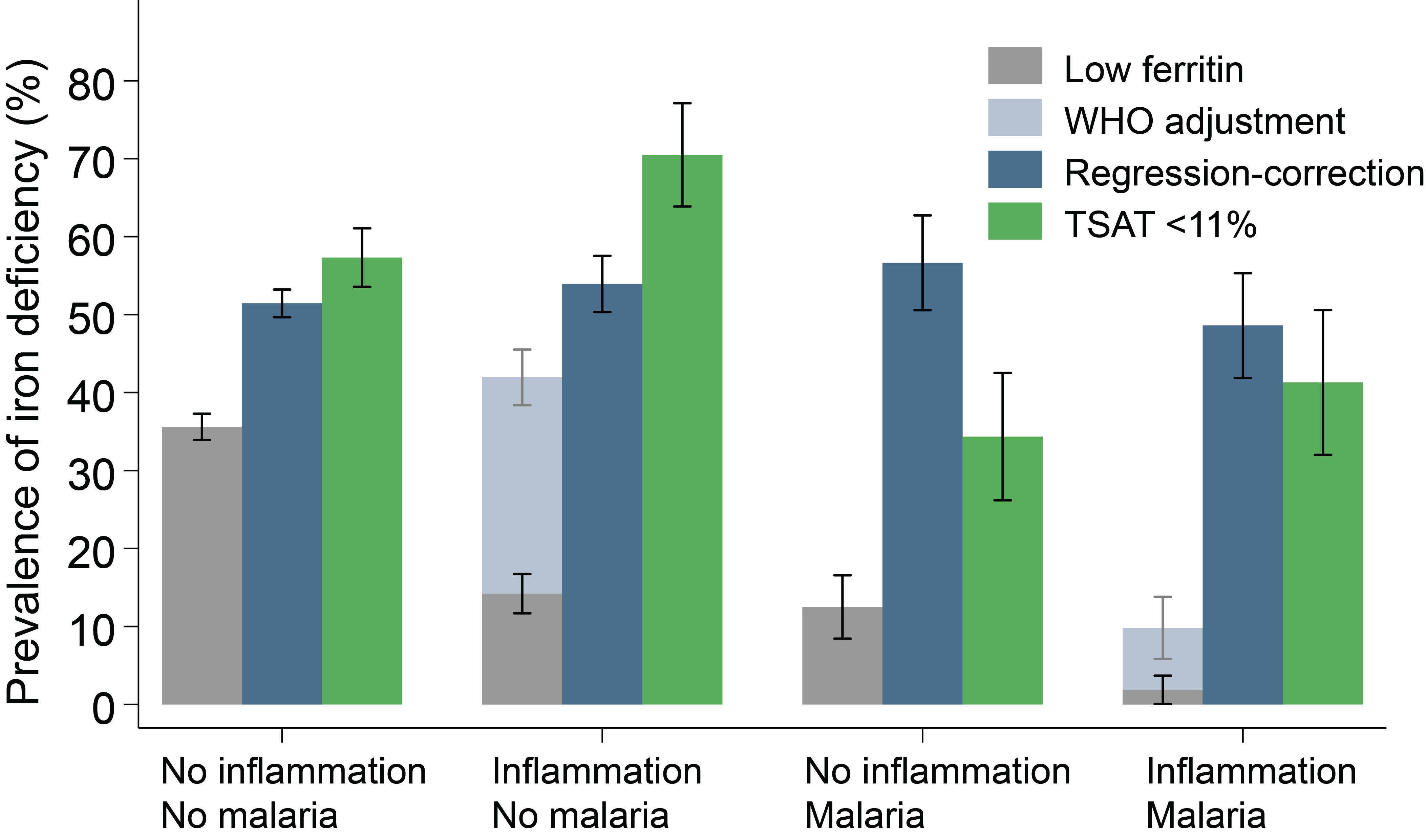 Background Iron deficiency (ID) is a major public health burden in African children and accurate prevalence estimates are important for effective nutritional interventions. However, ID may be incorrectly estimated in Africa because most measures of iron status are altered by inflammation and infections such as malaria. Through the current study, we have assessed different approaches to the prediction of iron status and estimated the burden of ID in African children. Methods We assayed iron and inflammatory biomarkers in 4853 children aged 0–8 years from Kenya, Uganda, Burkina Faso, South Africa, and The Gambia. We described iron status and its relationship with age, sex, inflammation, and malaria parasitemia. We defined ID using the WHO guideline (ferritin < 12 μg/L or < 30 μg/L in the presence of inflammation in children < 5 years old or < 15 μg/L in children ≥ 5 years old). We compared this with a recently proposed gold standard, which uses regression-correction for ferritin levels based on the relationship between ferritin levels, inflammatory markers, and malaria. We further investigated the utility of other iron biomarkers in predicting ID using the inflammation and malaria regression-corrected estimate as a gold standard. Results The prevalence of ID was highest at 1 year of age and in male infants. Inflammation and malaria parasitemia were associated with all iron biomarkers, although transferrin saturation was least affected. Overall prevalence of WHO-defined ID was 34% compared to 52% using the inflammation and malaria regression-corrected estimate. This unidentified burden of ID increased with age and was highest in countries with high prevalence of inflammation and malaria, where up to a quarter of iron-deficient children were misclassified as iron replete. Transferrin saturation < 11% most closely predicted the prevalence of ID according to the regression-correction gold standard. Conclusions The prevalence of ID is underestimated in African children when defined using the WHO guidelines, especially in malaria-endemic populations, and the use of transferrin saturation may provide a more accurate approach. Further research is needed to identify the most accurate measures for determining the prevalence of ID in sub-Saharan Africa.